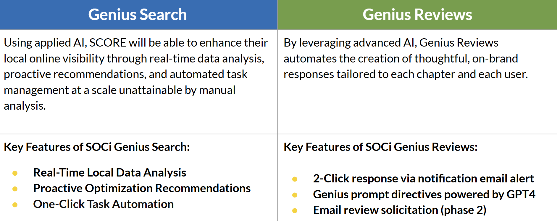 Genius Reviews and Genius Search are two new products from SOCi designed to simplify and streamline how multi-location organizations like SCORE manage online reviews and optimize local profile listings using advanced AI technology. We are always exploring ways to enhance the Chapter Social Media Program, and BOTH tools are activated on the 50 Chapters received full social media support!
