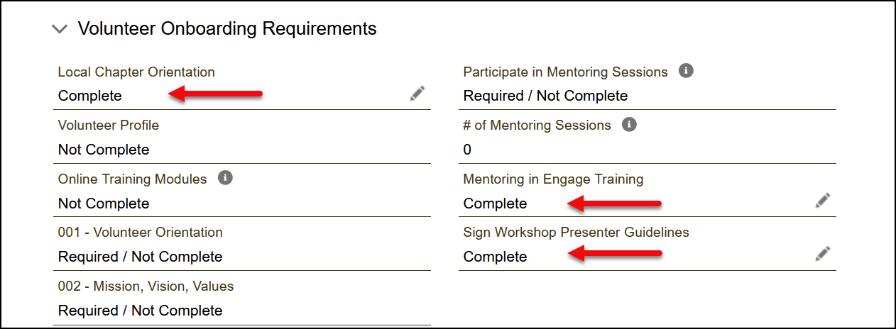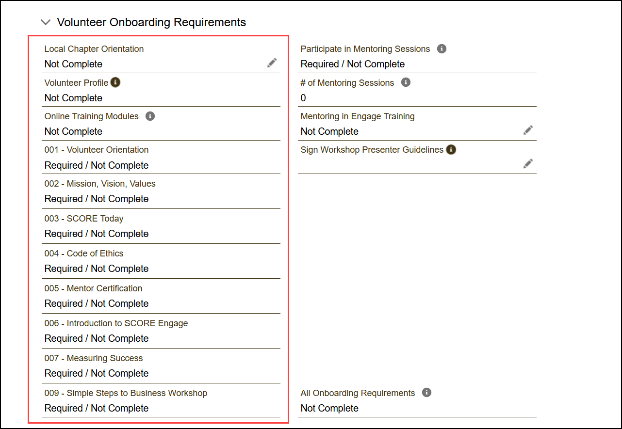 Scroll down to the bottom and view the Volunteer Onboarding Requirements section and review required and not completed fields.
