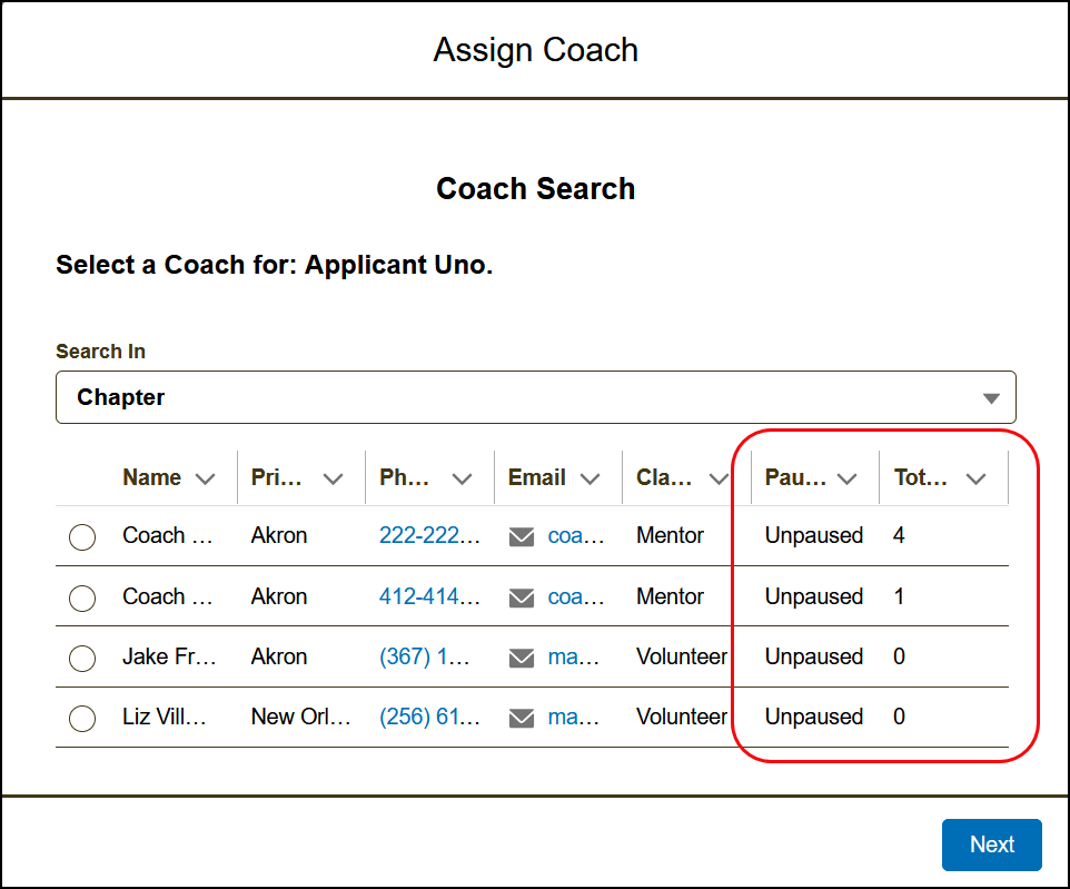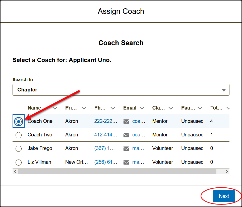 ➤ TIP: If you already know the coach’s name, set Search In to All Chapters, then use the Search by Name field.➤ TIP: Use the Pause Mentoring and Total Coach Assignment columns to help choose the most appropriate coach. - Click Next to save the assignment.