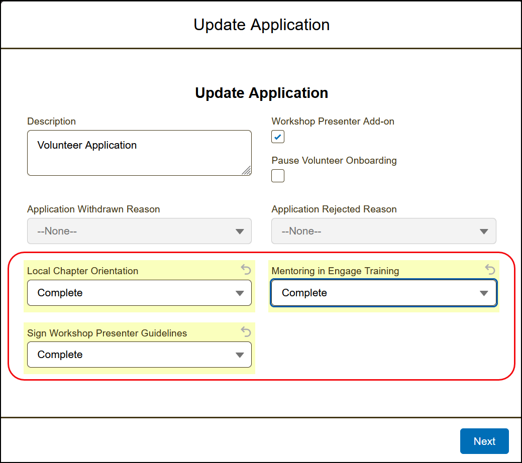 When a provisional volunteer expresses interest in becoming a Workshop Presenter, they must first review and sign the Workshop Presenter Guide. Once confirmed, follow the steps below to update their application in Engage.