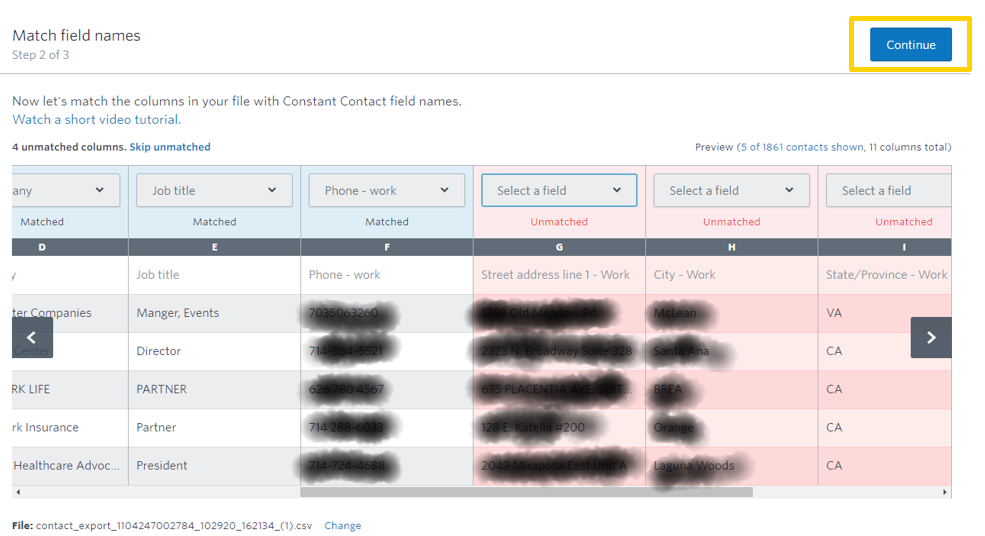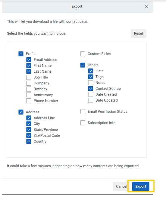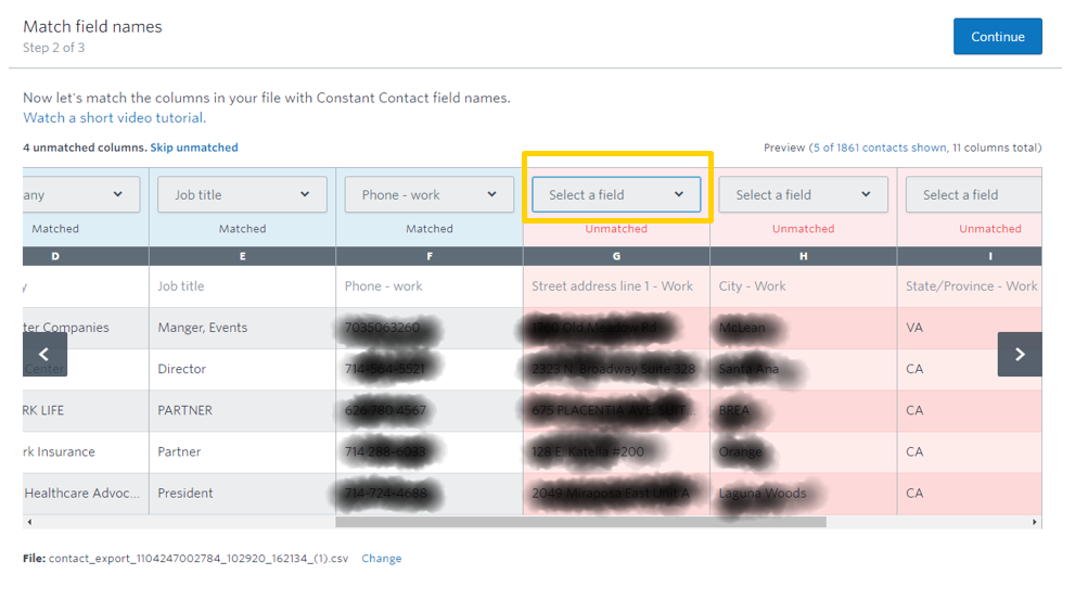 5 - Select the appropriate fields you would like to bring over. For example: Email Address, First Name, Last Name, Job Title, Company, Phone Number, Address Line, City, State/Province, Zip/Postal Code, Country, Lists, Tags, Contact Source