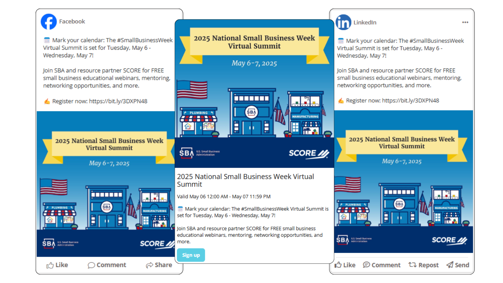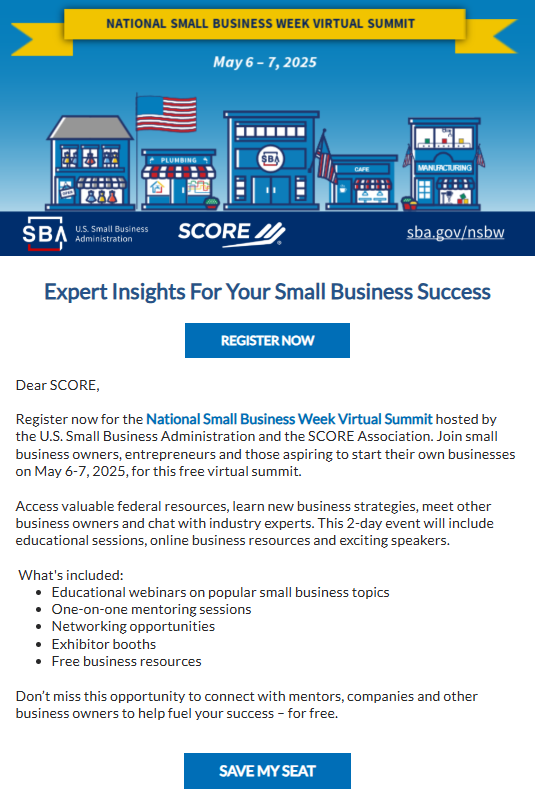 The U.S. Small Business Administration and SCORE Association will host a free, 2-day Virtual Summit during National Small Business Week. The summit will occur Tuesday, May 6 – Wednesday, May 7, 2025.