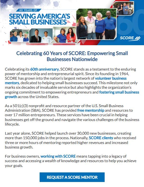 SCORE is celebrating 60 years of service to America’s small businesses! To learn more, request a mentor or volunteer to be one, visit score.org.