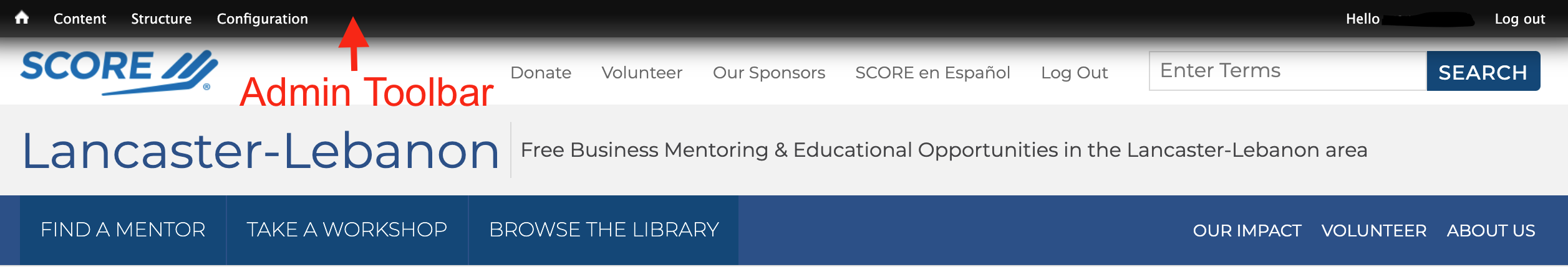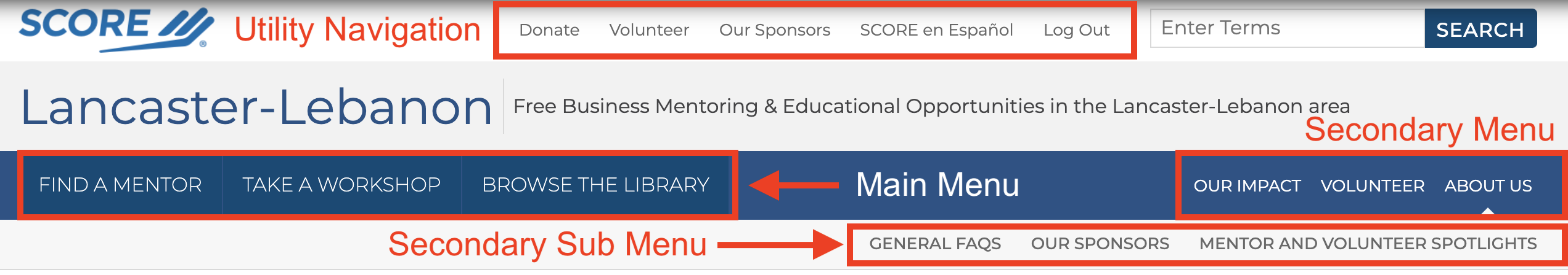 • Utility Navigation: This menu is located above the site search bar in the upper right corner. These links help users engage with our organization ways beyond the standard SCORE services. This includes making donations, becoming a volunteer, and logging in to the site. 'Donate', 'Volunteer', and 'Log In / Log Out' are not editable. An additional three menu items are allowed.