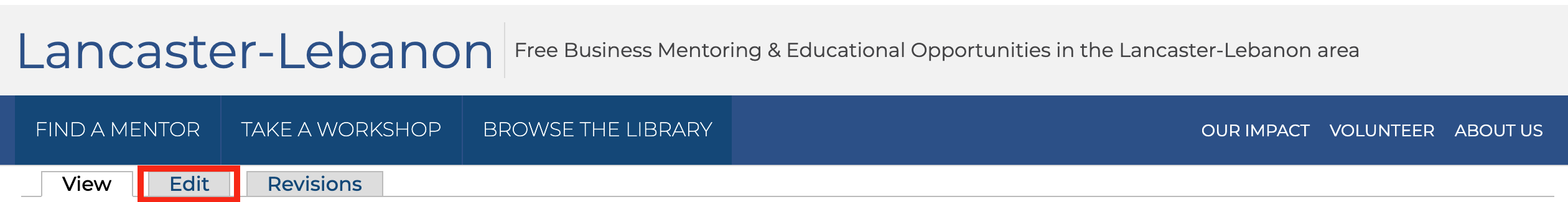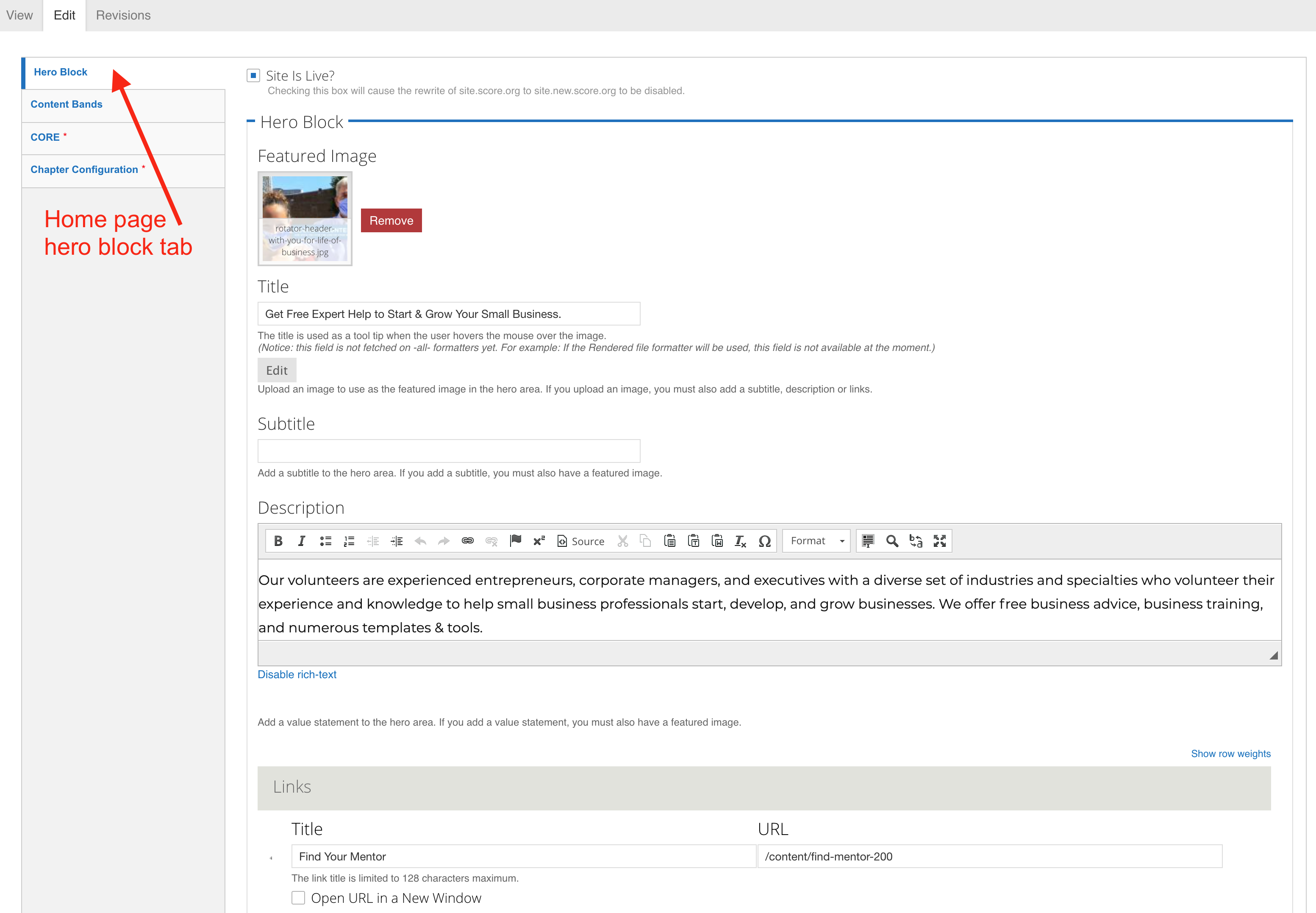 When your site has been prepared and you have been notified on how to log in you can begin the process of preparing your site. When logged into your site and you have navigated to your Chapter Landing Page you will see an additional group of tabs below the main menu links. By clicking on the ‘Edit’ tab you will be able to start setting up your Hero Block, home page Content Bands, and Chapter Configuration.