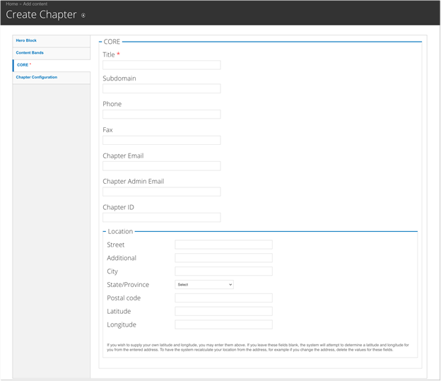 The CORE section of the Chapter data is non-editable in Drupal and may only be updated in CORE or Engage. This includes the “details” about a Chapter, such as its name, webmaster, chapter email address, chapter ID, and location. This section is available on the website to show you what information is being pulled from CORE or Engage. Log in to CORE or Engage to make changes to this information.