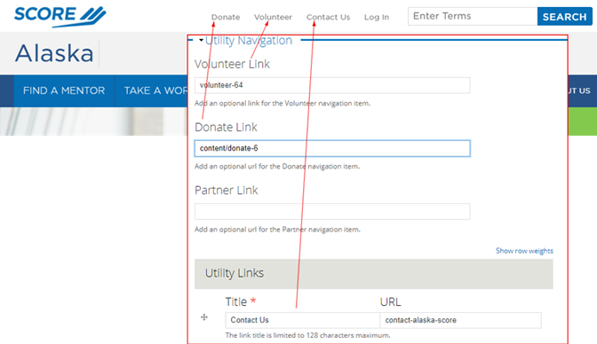 • Utility Links: These are optional fields allowing chapters to add additional links to the utility navigation for their site.