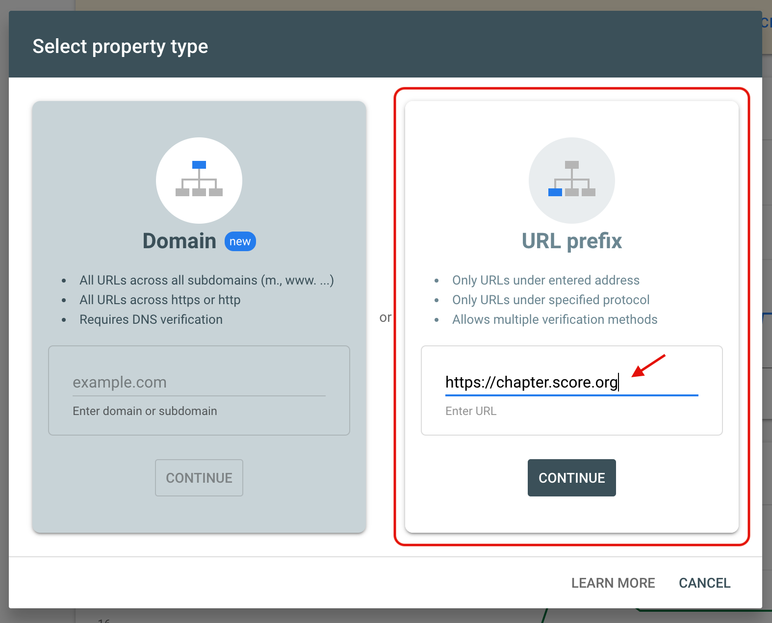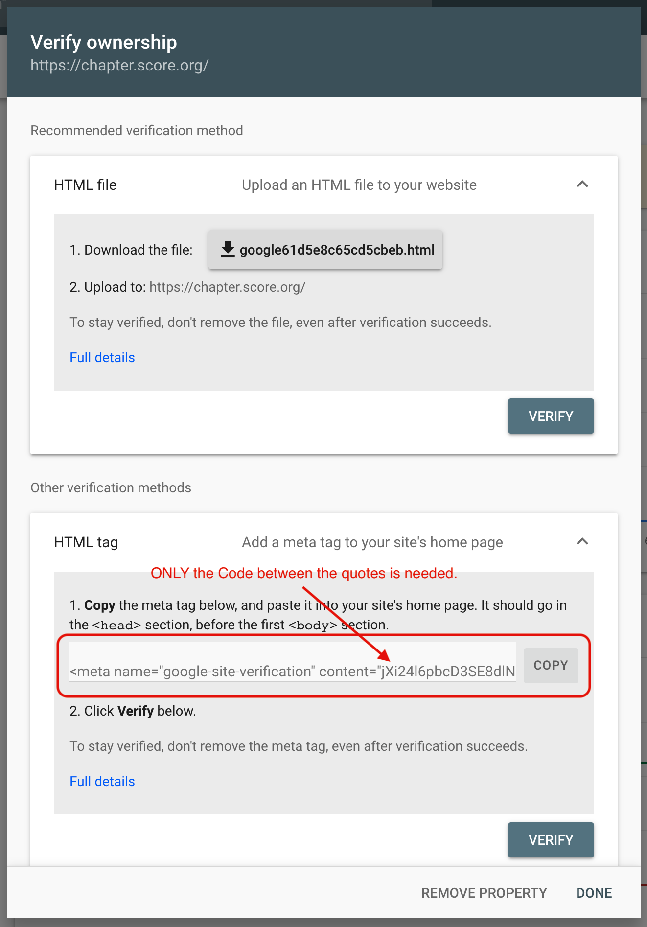 Google may need to verify your website ownership and control for several reasons across its product offerings. Website verification shows Google that you have administrative control of your website by having you prove that you can place a hidden tag on your home page. Note that other methods are available but our focus will be on the meta tag insertion method. The Google Site Verification field in the Chapter Configuration section facilitates this process. Some examples of Google products that require verification are use of Google Search Console, Google Analytics, Google Tag Manager, Google Workspaces, and Google Ads. (Note that access to Google Analytics is already configured and can be shared with you by HQ. Simply email [email protected] and be sure to send an email address attached to a valid Google account to be granted access.) Most of these Google products are unnecessary for chapter needs. The most common Google product chapters use where this verification is necessary will be Google Ads. You can find specific information on verifying your site through Google Ads here. The following screenshots show the process of verification through Google Search Console, a helpful SEO tool, that may help guide the process of obtaining the verification code. Note that all of the methods will contain the actual code that is needed to populate the Verification field on the website, the code is a long random string of letters, numbers and symbols that can be copy/pasted to the field.