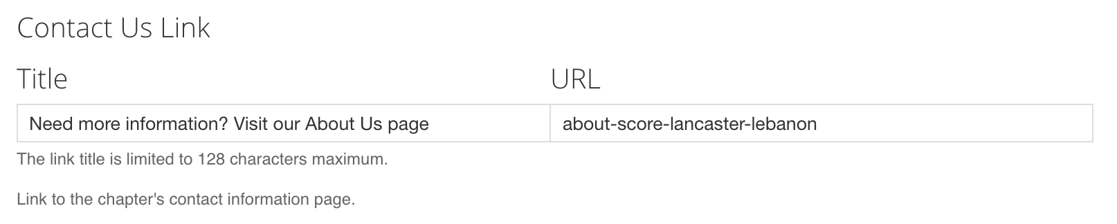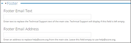 Contact Us Link: Use this field to update the text and link for the contact us messaging in the footer.  As with most fields discussed in this section, a default value is provided and may be left in place, but each chapter can overwrite this with its own text and links.