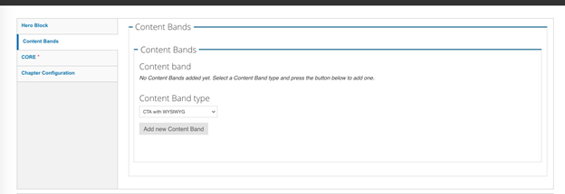 Chapter homepages are landing pages built using content bands. Please select the desired content bands from the drop-down menu. Follow the directions in the “Add a Content Band” section for details.