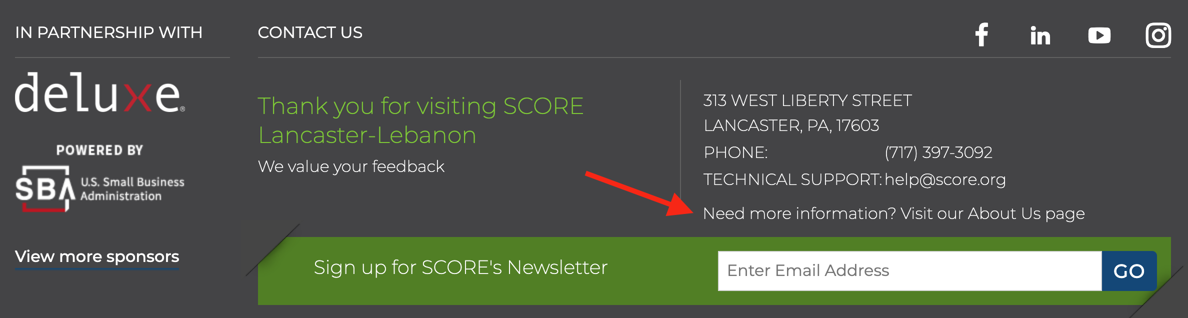 • Connect with SCORE: Enter the Text that you want to appear to the left of the Social Media links, which is to the left beneath the Hero. We suggest something like, “Connect with Richmond SCORE”.