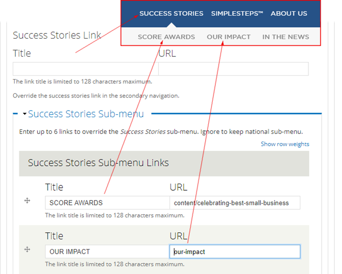 • Success Stories Sub-menu Links: You can add up to 6 links to appear in the submenu of the success stories link that you create for your chapter.