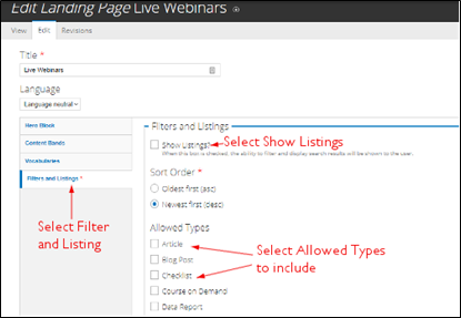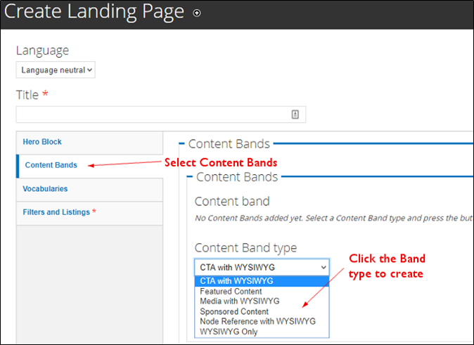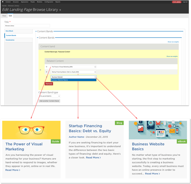 | Landing Page | A page designed to display a collection of content around one or many classifications. The homepage, Find a Mentor, Take a Workshop, and Browse Library pages are all landing pages and are constructed using content bands. |