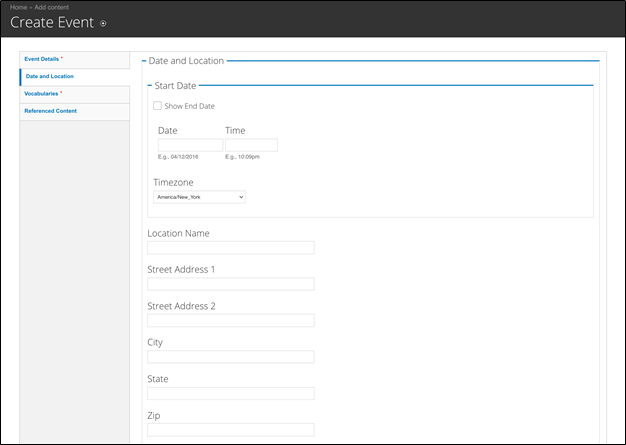It is recommended that you review every field in every tab and fill out the information as completely as possible. Some fields will not apply to the selected content type and can be left blank. For instance in the event content type, if adding a recorded webinar, date and time are not needed and can be left blank. However, there are some fields on all content types that should be completed every time. These include: