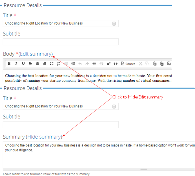 The summary is what appears in the content list on landing pages and search. If the summary is left blank, then the first few lines of the body copy will be displayed. The summary is also used as the page meta description (unless changed). So it is important that this is filled out whenever possible. This appears at the top of most pages just below the title and subtitle fields. You must click to display the summary field on the page. See the image below.