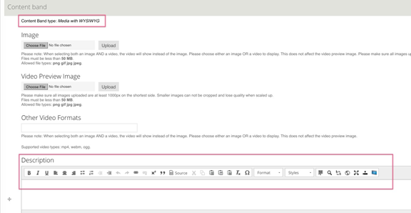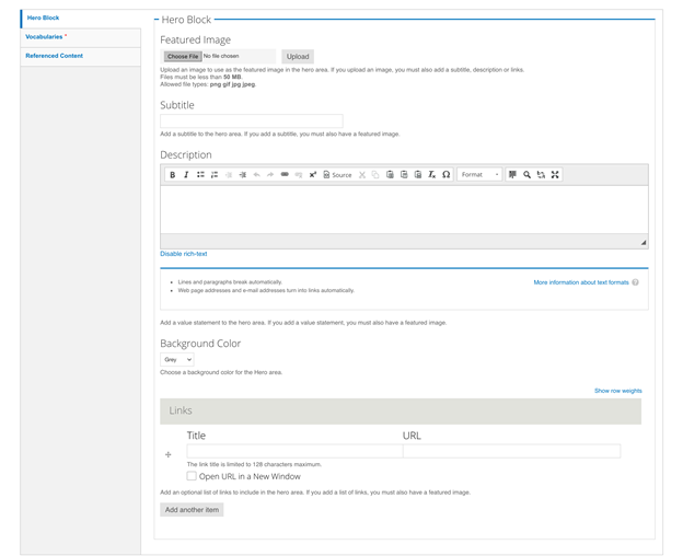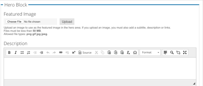 Description: Appears beneath the optional subtitle. There is a WYSIWYG to enter text to supplement the featured image. See Hero WYSIWYG Section.