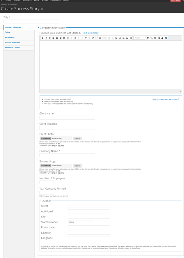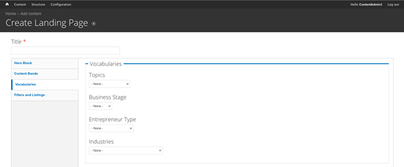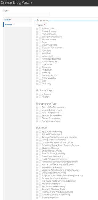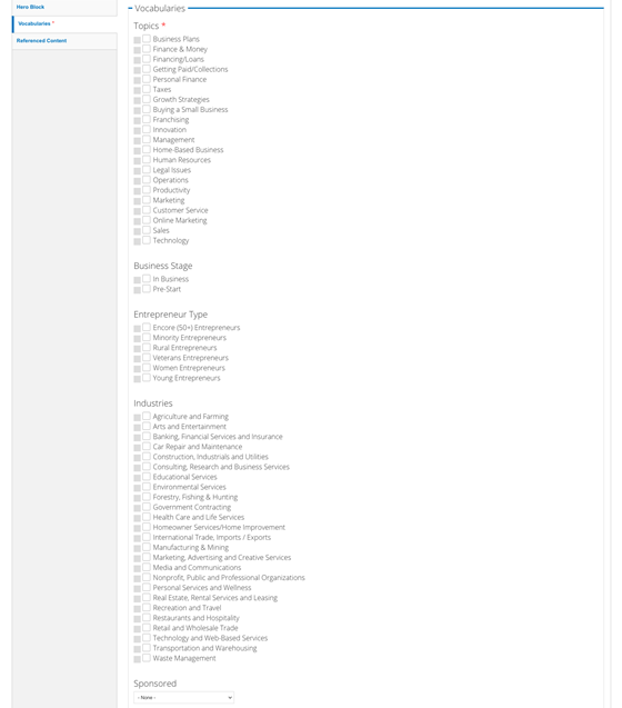 - Industries & Entrepreneur Types: For both industries and entrepreneur types, it is recommend that you only selecting those vocabularies that the content speaks specifically to for an audience.