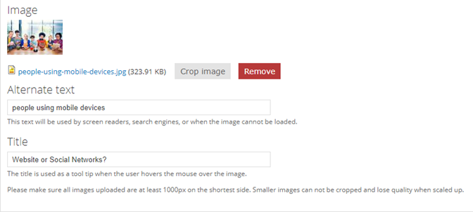 When adding an image, the title and alternative title should always be completed. This text describes the image for search engines, end users and for handicap accessibility tools.