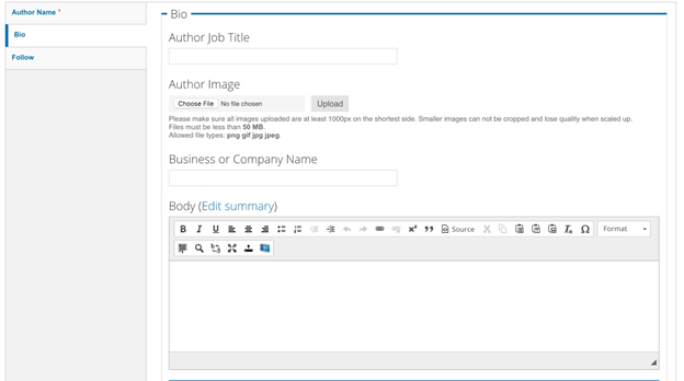 Body: WYSIWYG Text Area to enter the biographical details for this author.