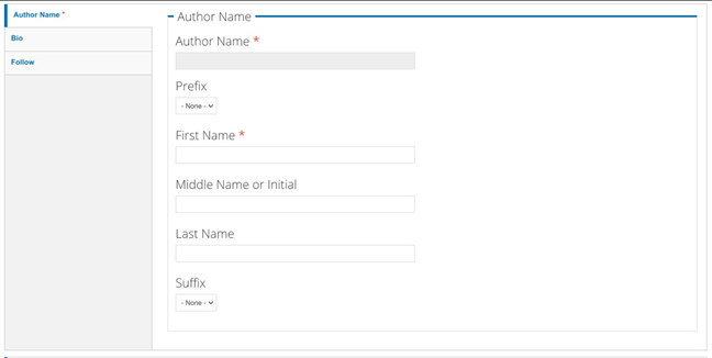 Author Name: Fill in the Prefix, First Name, Middle Name, Last Name, and Suffix Fields. This information populates the page heading, breadcrumb and URL for the author page.