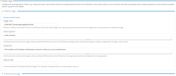 Meta Tags are important for Search Engine Optimization and should be reviewed/modified for every node created. There are default settings in place for the meta page title and description. They reference the page title you entered when creating the page and the summary entered with the body of the page. You can override these as needed.