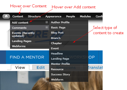 Each piece of content you create is called a node (i.e., a page). To add a node, navigate to the admin menu. Hover over Content, then from the drop menu hover over add content, then select the content type that you would like to create. Alternately, click on Content in the admin menu bar, then click Add content and then select the content type to create from the list.