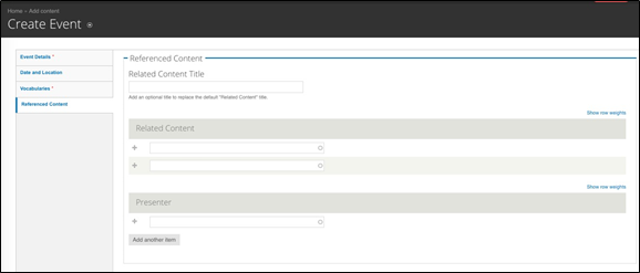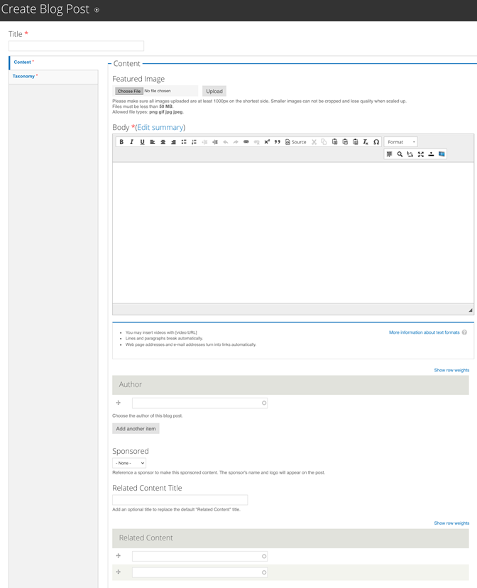 After selecting a new node type two sets of tabs will be visible on the left side. The top set of tabs are specific to the content type you’re using. The bottom set of tabs are page options that you’ll find on every node on the site.