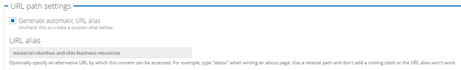 This determines the URL for the page. The default setting includes a prefix based on content type (i.e. event/ or resource/) and the page title separated by hyphens. The only time you should uncheck the box to generate the auto alias is if punctuation appears in the URL or need to manually override this to create a specific URL.