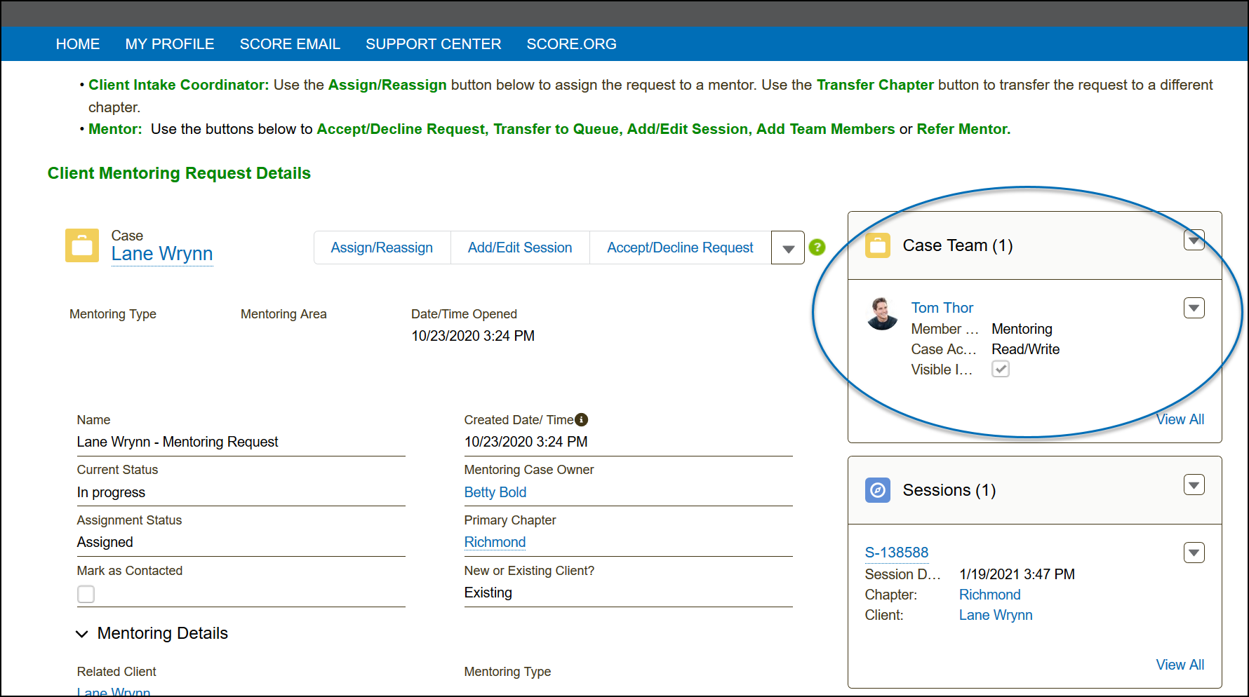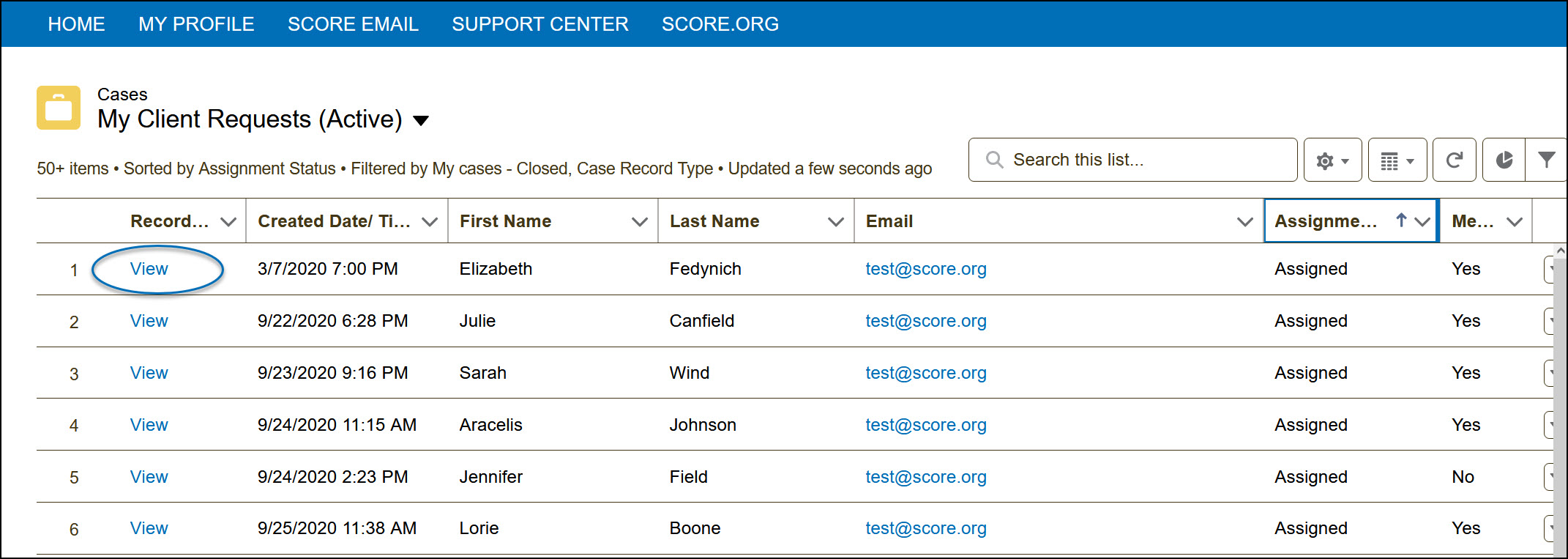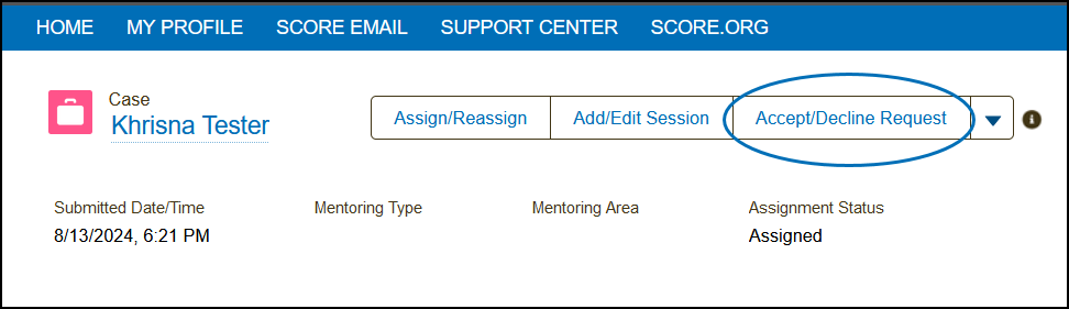 A mentor is required to accept/decline a mentor request when assigned a mentoring request case. The system sends a notification to the mentor to start this process. They will also receive a 24-hour reminder email about the assigned request. Another notification email is sent in 48 hours if the mentor has not accepted or declined the request. The mentoring request is returned to the Client Intake Queue after 5 business days (excluding weekends) have elapsed. The Client Intake Coordinator receives a notification email when the request is returned. In addition, the client also receives an email about the delay. View the notifications here. (You must be signed in to your @scorevolunteer.org account). To accept/decline a mentoring request, please follow the steps below.