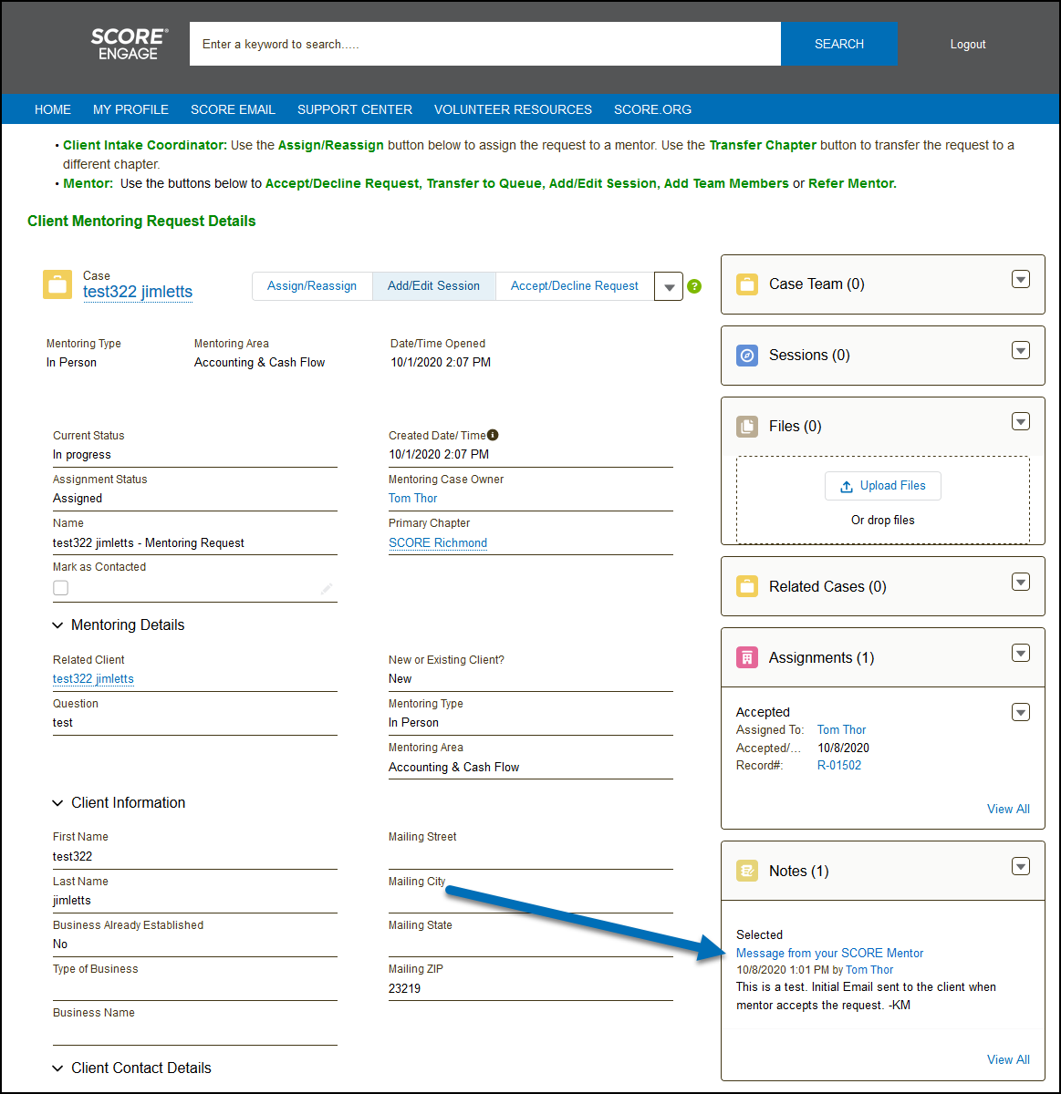 1) From the Client Mentoring Requests Details page, click the down arrow