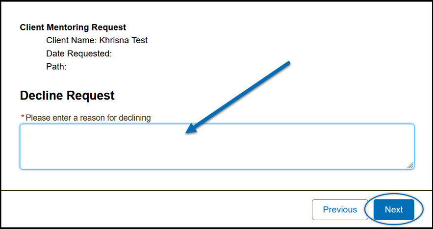 5b) Declining the Assignment -When you select Decline Assignment, you are required to enter a reason for declining on the next page. The client mentoring request will return to the client intake queue and the Client Intake Coordinator will be notified to reassign the request.