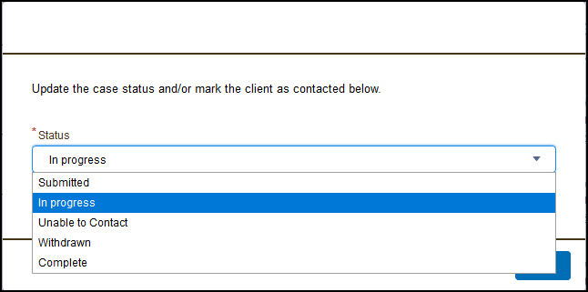 - Update the case status and/or mark the client as contacted by checking the box. Then, click the Next button to save the change.