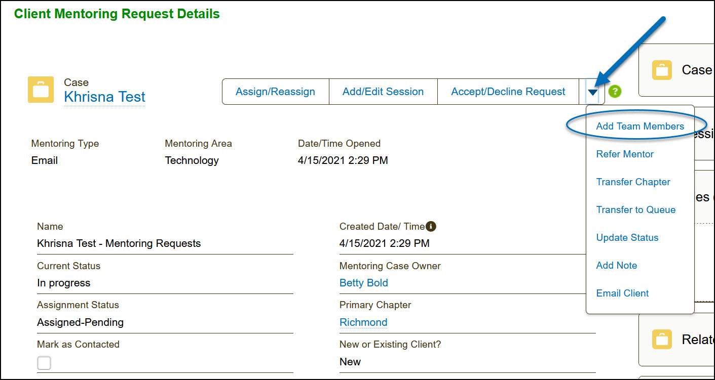 A team member is another person that has view/edit access to the mentoring request. In Engage, adding a team member to a mentoring request assigned to you means that the team member who is an active mentor has the ability to view and add their own mentoring session to the same mentoring request. Provisional mentors and Subject Matter Experts will still have view access but are unable to add their own mentoring session until they are active and/or change their classification to Mentor respectively.