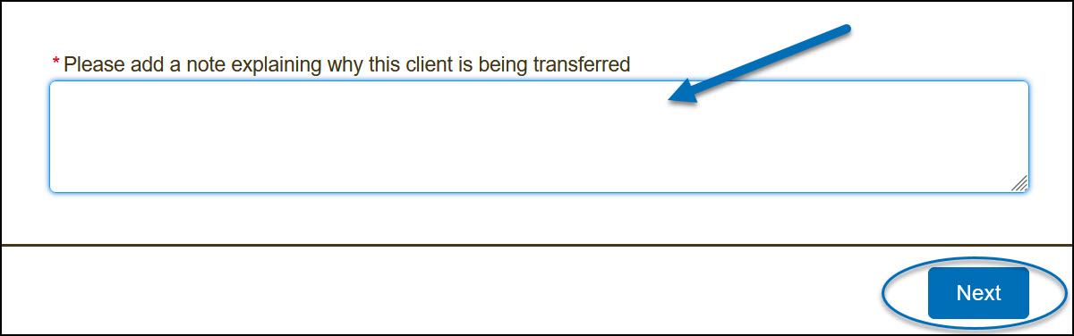 2)Enter a reason for transferring the request back to your chapter's Client Intake Queue and click Next. Note: This note will also be saved in the related section in Notes.