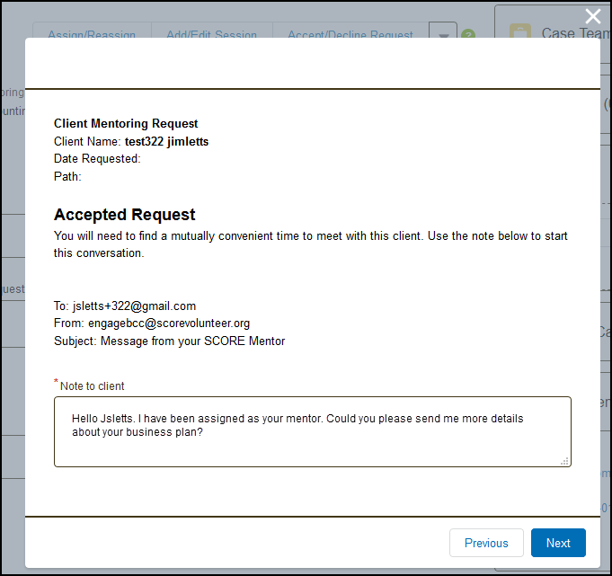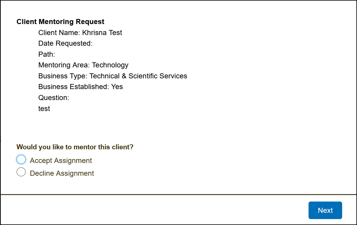 Once a client has been assigned a mentor, the mentor will receive an email notification from Engage to inform them of the assignment. The mentor can access the client record from a link provided in the email. Once in the system the mentor must accept or decline the request assignment. If the mentor declines the request, the client request will go back into the client intake queue where the Client Intake Coordinator will assign a different mentor. If the mentor accepts the request, they can review the request and reach out to the client to schedule a session.