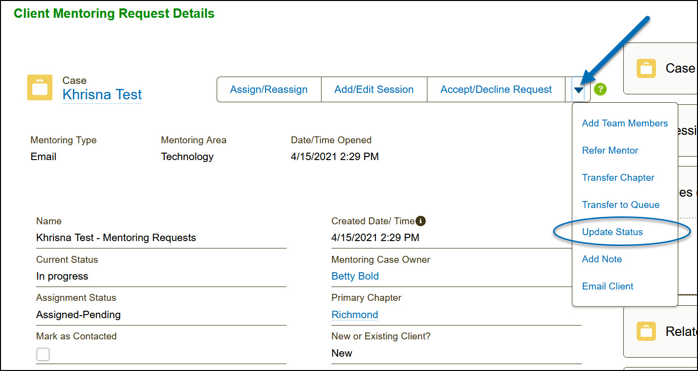 - To update a client’s mentoring request status, access the mentoring request record in the system. From the Client Mentoring Request Details page, click the down arrow