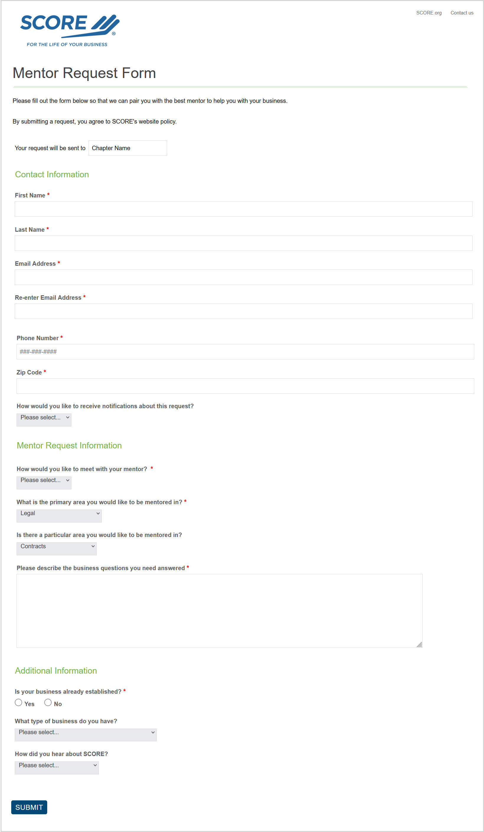 1) Access the mentor request form and have the client complete it or complete it on their behalf. Copy and paste the URL as follows, replacing the ending with your four-digit chapter number: https://score.tfaforms.net/16/?companyid=XXXX