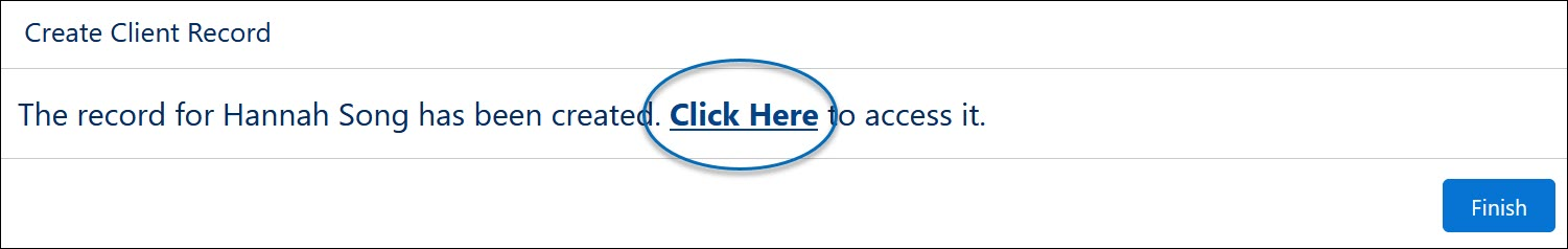 4) To access the newly created client contact record, click Click Here on the screen below. And if you have multiple client contact records to create, click Finish to repeat the process.