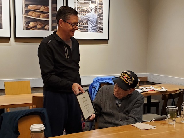 Harold "Bud" Roth recently received a special Diamond Award for his many years of meritorious service with SCORE. Bud, at the age of 98, still remains connected to the Pittsburgh Chapter attending most meetings as he is able. The award was presented to Bob by District Director Mark Fallek (photos below).