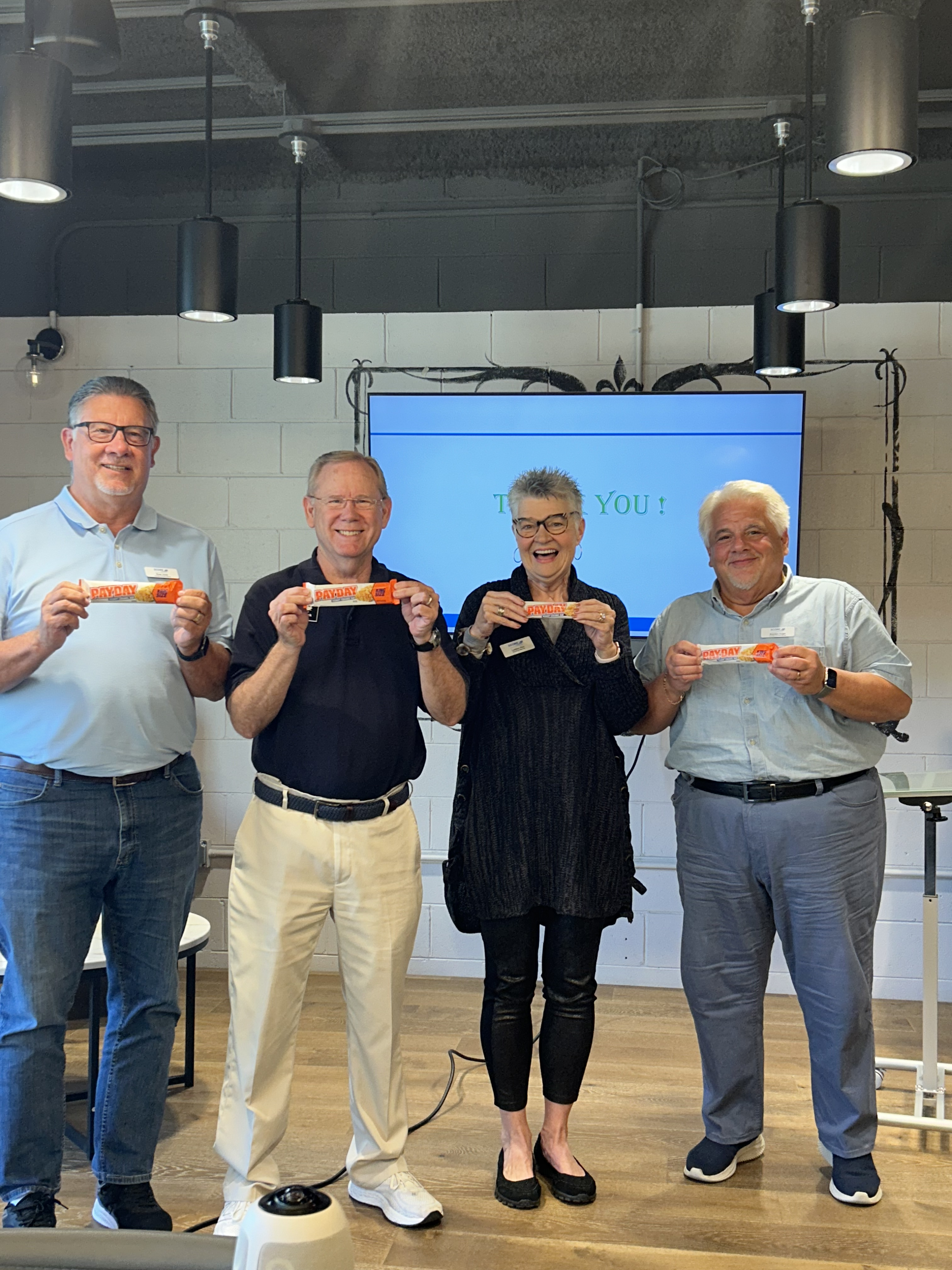 At a recent SCORE Indianapolis chapter meeting held at a co-working space, Chapter Chair Tom Morgan recognized some of the chapter's high-performing mentors. Each month, Morgan reviews the previous month's NPS score and recognizes each mentor who receives a 9 or 10 from their client surveys. They call this the "Big 10" Award and those who qualify receive a PayDay candy bar and get their photo taken. Mentors who have over 100 mentoring sessions in the fiscal year receive a supersized Candybar and get their photo taken as well. Morgan likes to share some of the comments from feedback surveys as well to motivate and recognize these hard-working mentors. Below are some photos of the most recent chapter recognition!
