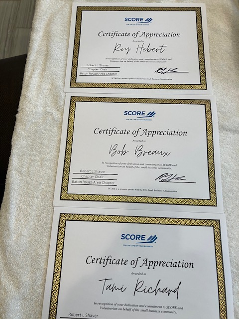 SCORE Baton Rouge Area has recently implemented a new recognition program. It includes an award for "Chairman's Choice" for a mentor who contributed the most that quarter. A second award for "Mentor of the Quarter" requires nominations from volunteers; they must select the mentor they feel most deserves recognition that quarter. Both of these awards come with a certificate of appreciation and a chance to choose an item from the SCORE Store. There is also an award for SCORE Clients! The "Client of the Quarter" receives a certificate and is invited to the annual Chapter Recognition Event. To bring new volunteers into the fold, SCORE Baton Rouge Area gives newly active mentors a personal card of congratulations from chapter leadership, a SLATE card, and a sticker. The program has received rave reviews. Here is what new mentor, Carla Louis, shared on LinkedIn: "Today, I had the distinct pleasure of receiving a handwritten thank you card from the District Director of SCORE Louisiana, Bob Shaver, marking a heartfelt welcome into the Baton Rouge chapter of SCORE. This gesture, both personal and profoundly meaningful, symbolizes the beginning of what I anticipate to be an enriching journey ahead".