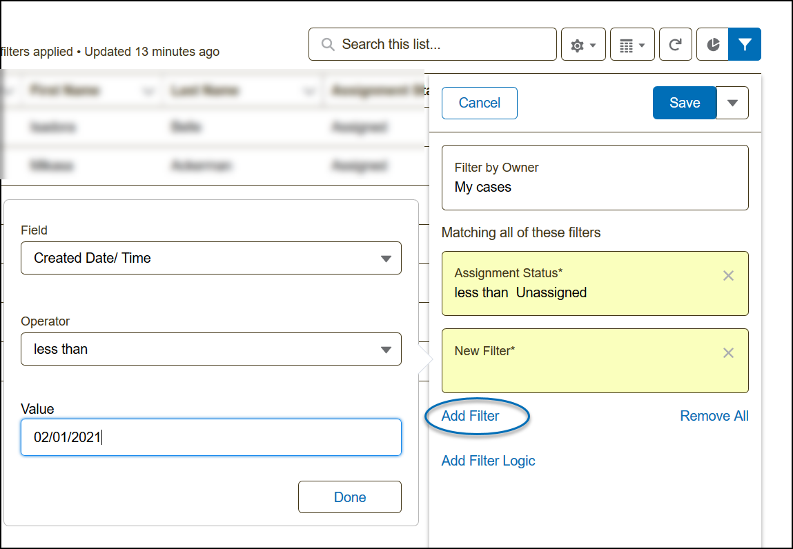 4a) To Add a Filter, select Add Filter. This will open a window on the left. Select the Field to filter, assign an Operator, and enter a Value. Click Done and the filter will not be added to your list view.