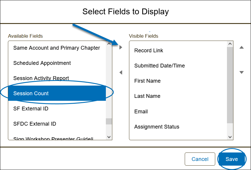 2) Select the field to make visible from the Available Fields, and click the right arrow to move the selected field to the Visible Fields box. Click Save.