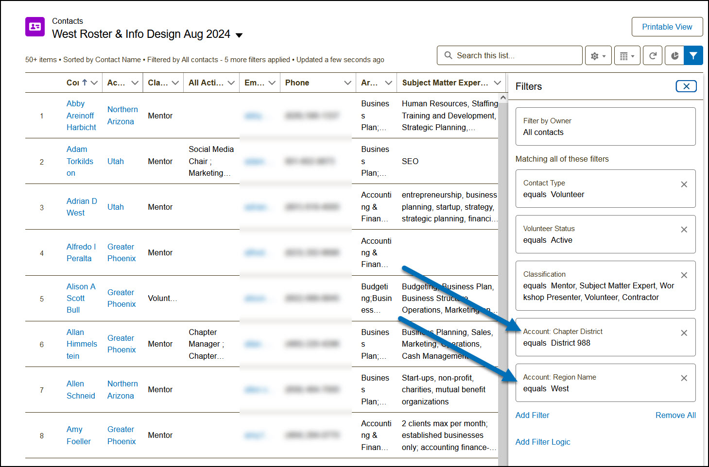 Follow the steps to Select Fields to Display and add the following columns to be displayed: Account: Chapter District and/or Account: Region Name