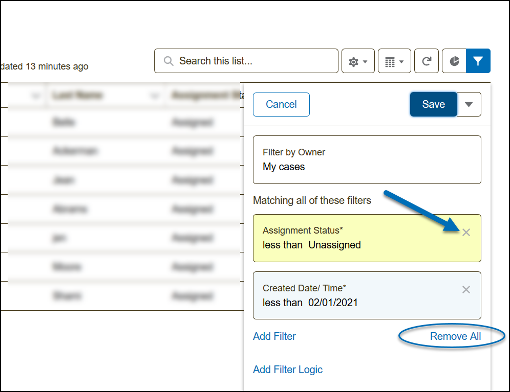 5) When done adding/removing filters, you can now click Save to save the changes and create your new list according to your filters. Note: After saving, the Filter panel remains open. You can close this by clicking the