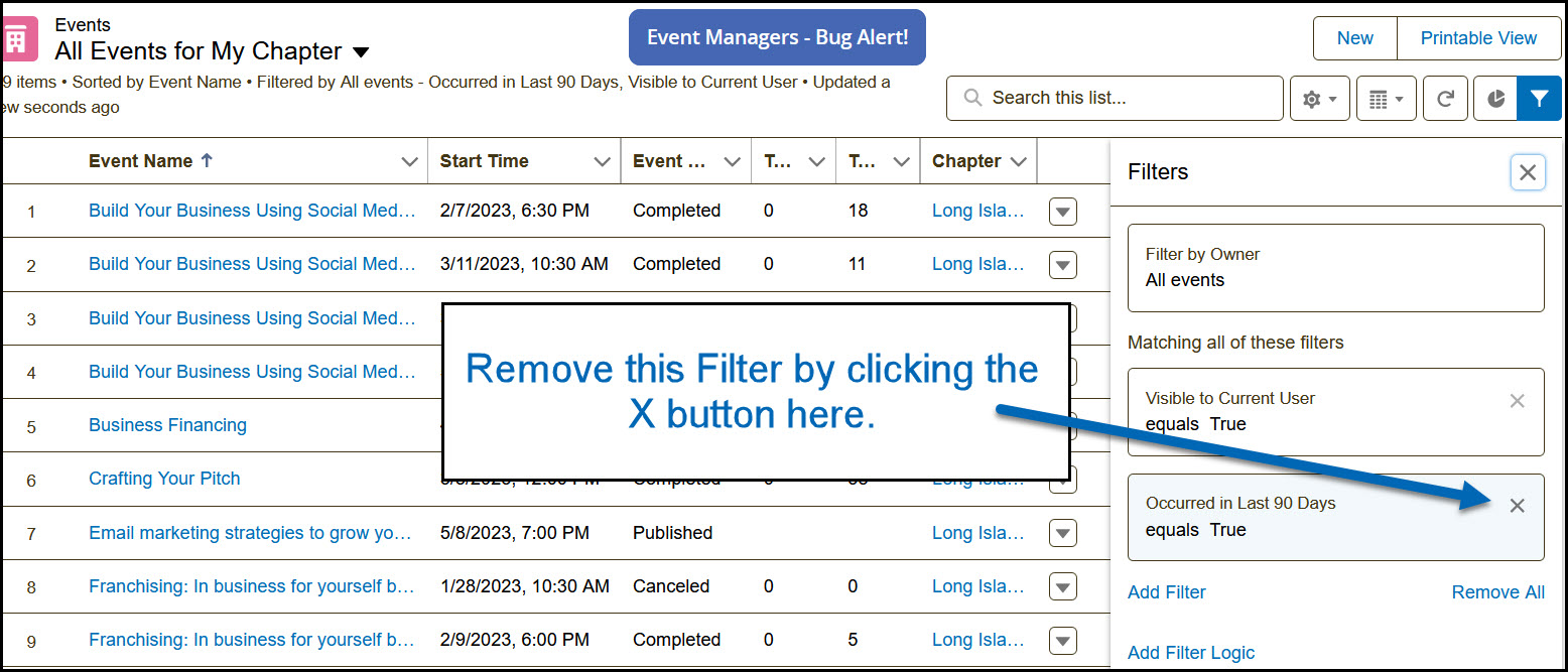 Steps: In the filter page, remove the filter for Occurred in Last 90 Days equals True.