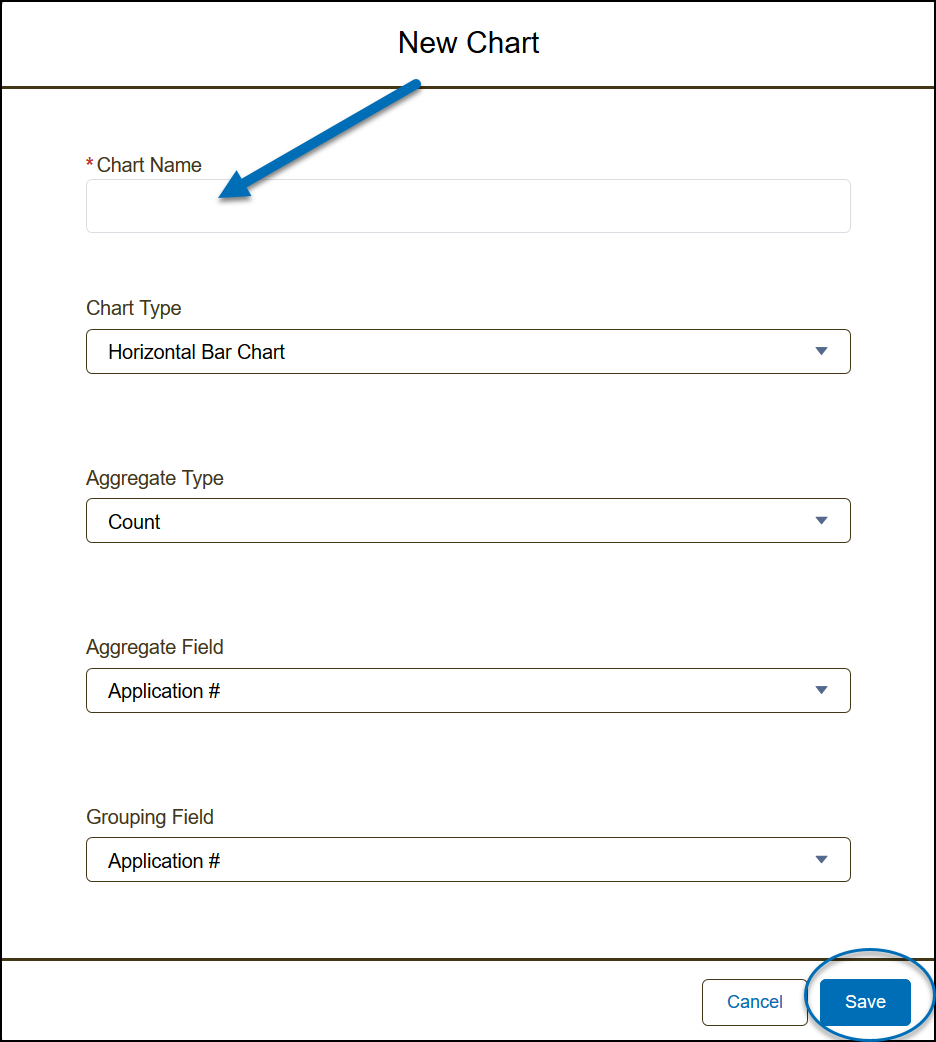 4) Enter the Chart Name and modify any fields applicable. Note: The Aggregate Type specifies how the field data is calculated: by sum, count, or average. The Aggregate Field specifies the type of data to calculate. The grouping field labels the chart segments.