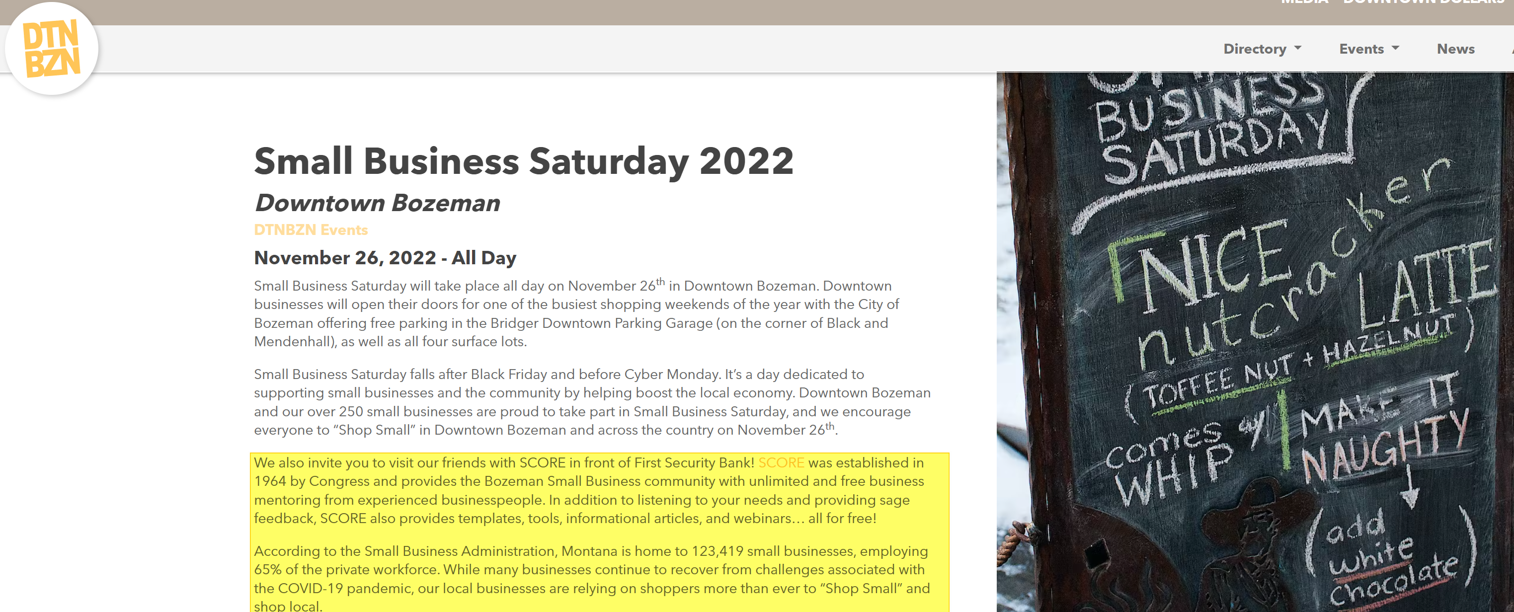SCORE Bozeman's great partnership with the Downtown Business Association, resulted in a joint event and wonderful feature in honor of Small Business Saturday this November. Check out the attached press release, on their website [https://downtownbozeman.org/event/small-business-saturday], and via social media. What a great way to keep SCORE top of mind for new and growing small businesses in the community!