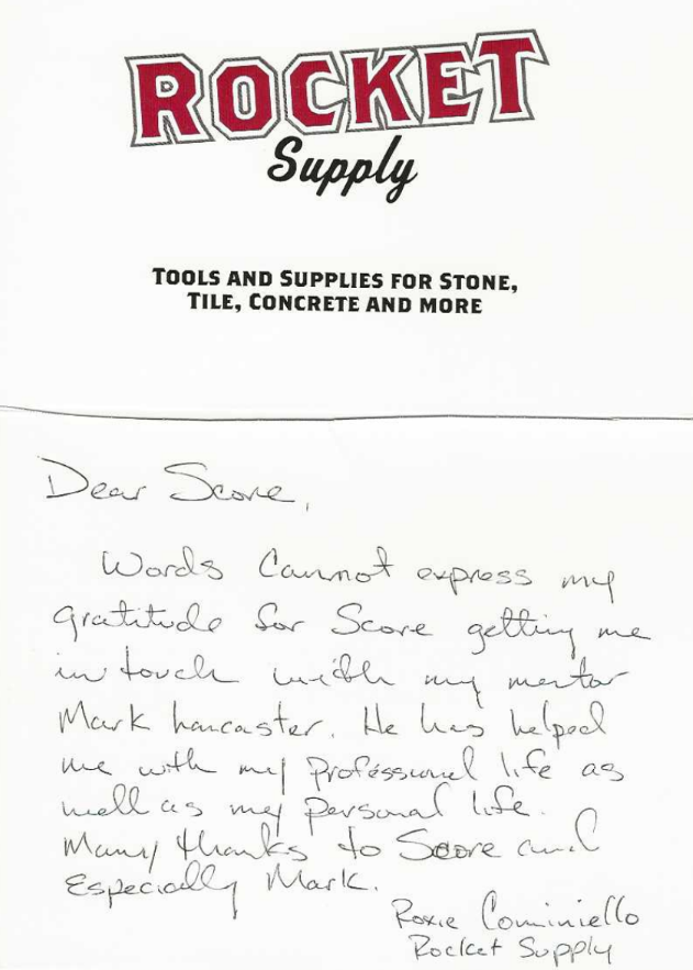 I just thought I would pass on a thank you note that the chapter recently received from a client - Rocket Supply. Our volunteer, Mark Lancaster, has been working with this client and they provided the attached note with an enclosed check for $1000 to support Denver SCORE.