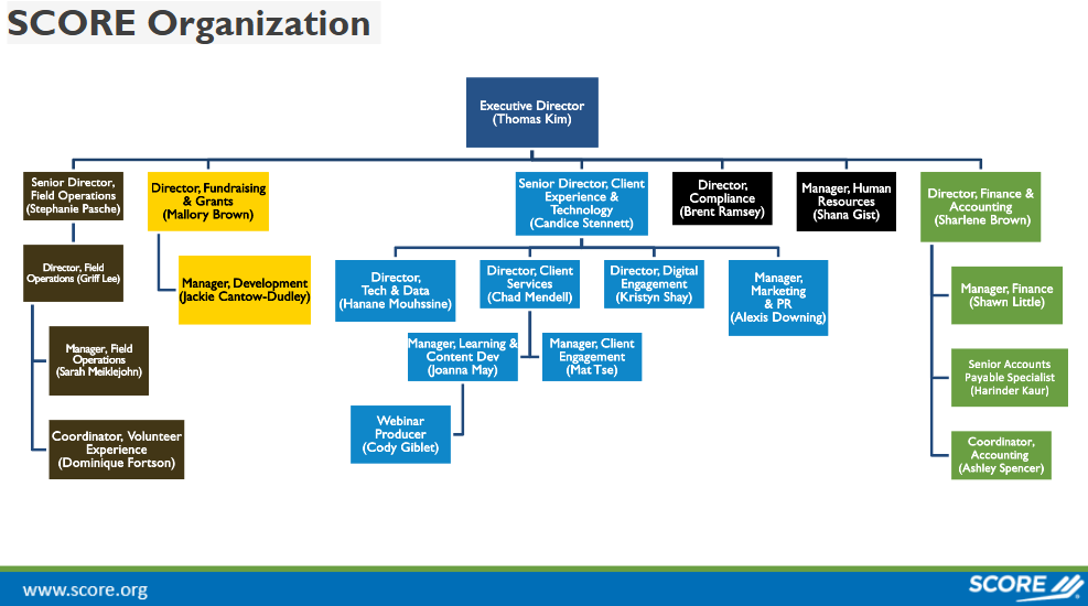 This SCORE Headquarters organizational chart reflects the current structure of staff and contractor roles supporting field operations, client engagement, technology, compliance, marketing, and finance.
